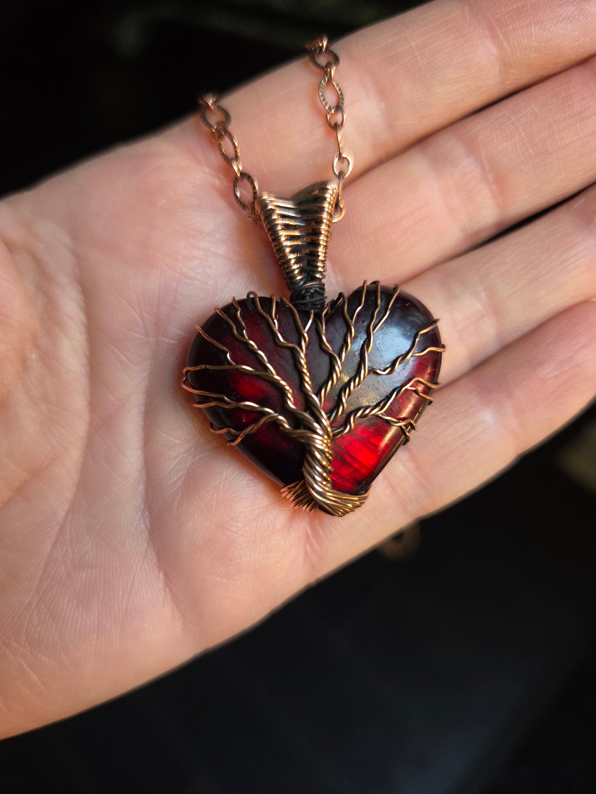 Ignite your inner fire and embrace transformation with this mesmerizing red flash labradorite heart, wrapped in warm copper and crowned with a handcrafted Tree of Life design.