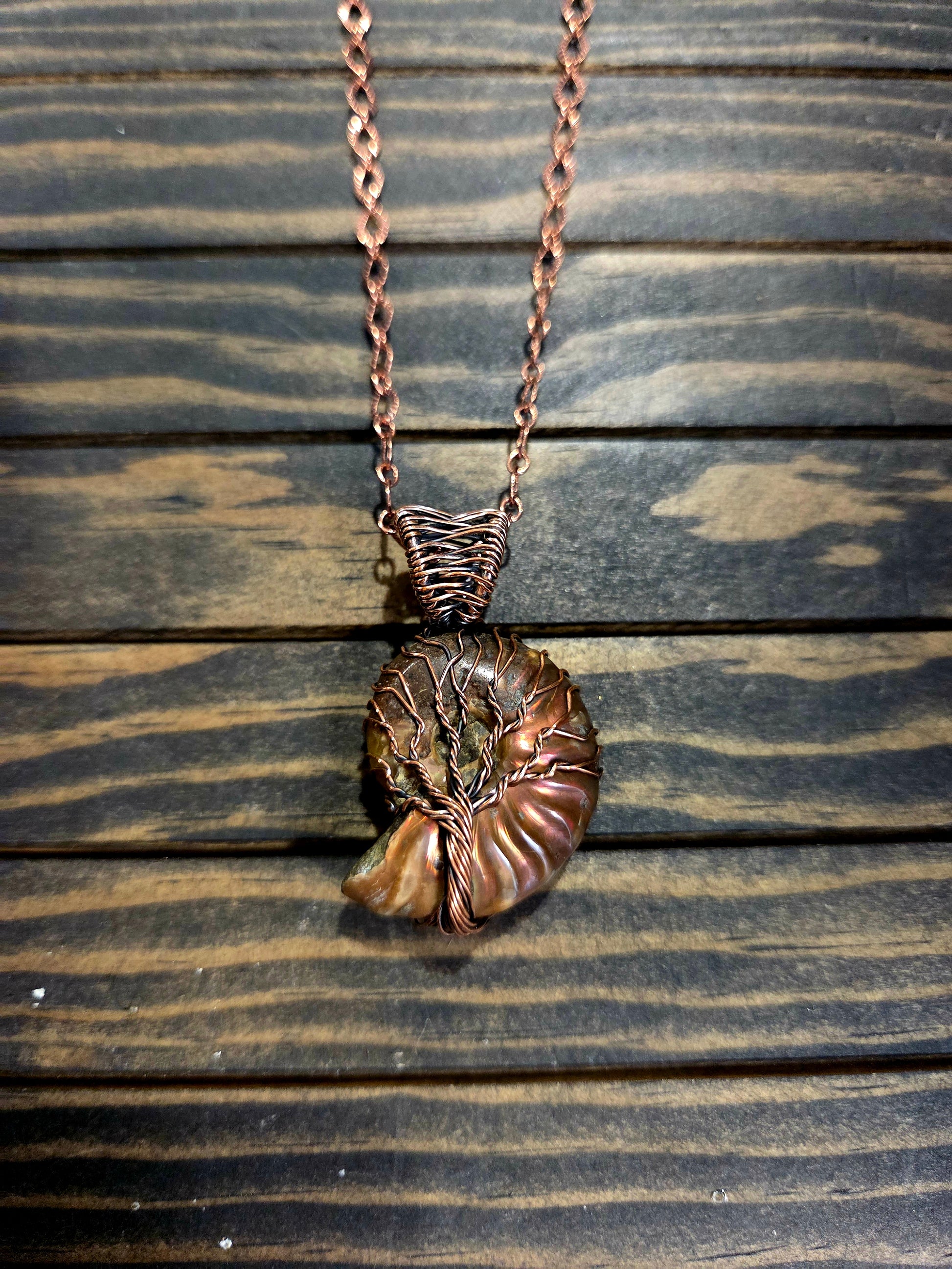Step into the ancient currents of time with this stunning ammonite fossil pendant, lovingly wrapped in copper and adorned with a hand-twisted Tree of Life design.