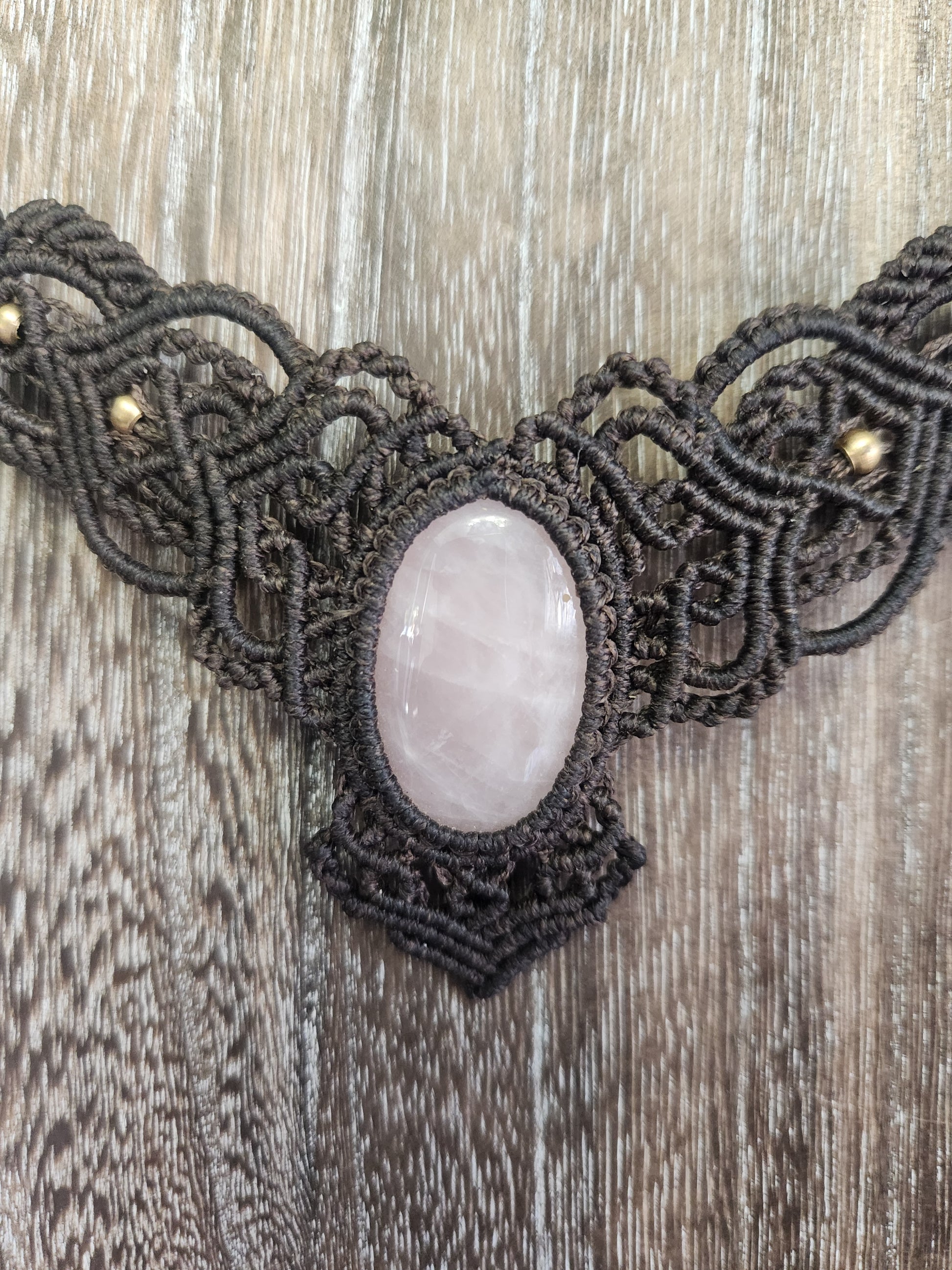 This handmade rose quartz macrame necklace, designed as a choker, features an adjustable pull cord for a personalized and comfortable fit.